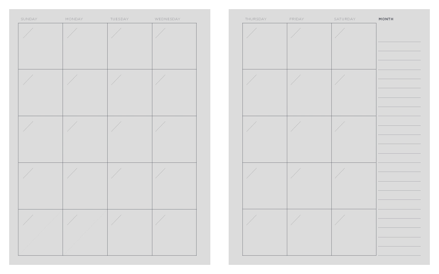 -12 dateless month overviews with a month spread over two pages and a space for notes; printed on gray paper so they're easy to find