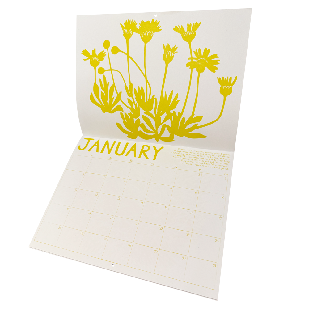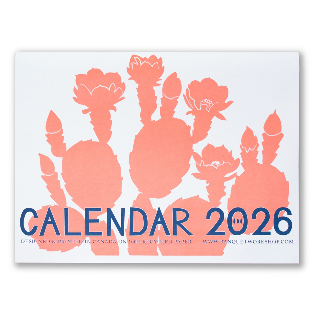 This year's write-on calendar from Vancouver, BC's Banquet Workshop brings you a year of high desert plants including barrel cactus, flaming sword, prickly pear, milk vetch, pink-eye poppy, and mariposa lily. Each month (Sun-Sat) is printed in Pantone spot colors including neon inks (brighter than they appear here) with plant profiles and factoids about it along with plenty of room to write. Includes a bonus January 2027 page and 2027 overview at the end.