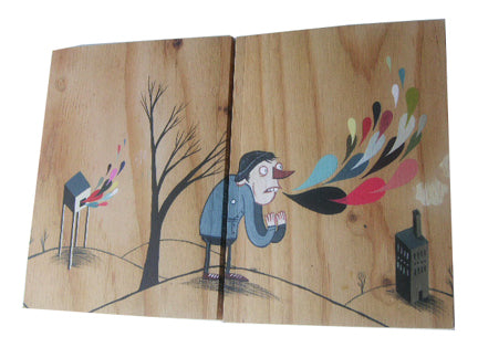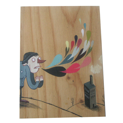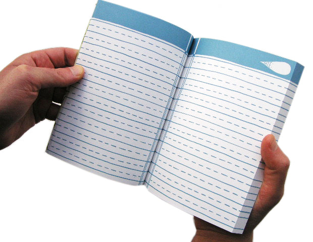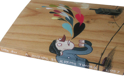 We are excited to be bringing you a handy lined journal from the funny and talented Jeremy Tinder! The awesome cover of this notebook is a full-color painting on wood with Jeremy’s comic style and vivid colors that wraps around from front to back. Fans of Jeremy’s Top Shelf books or self-published mini comics may not know he’s an accomplished painter, but here you get a nice display of his abilities. Inside you’ll find plenty of sturdy 80# white paper pages with blue lines drawn in a fun style and a speech bubble for the date. Altogether it makes for a great new repository for anything you can think of!