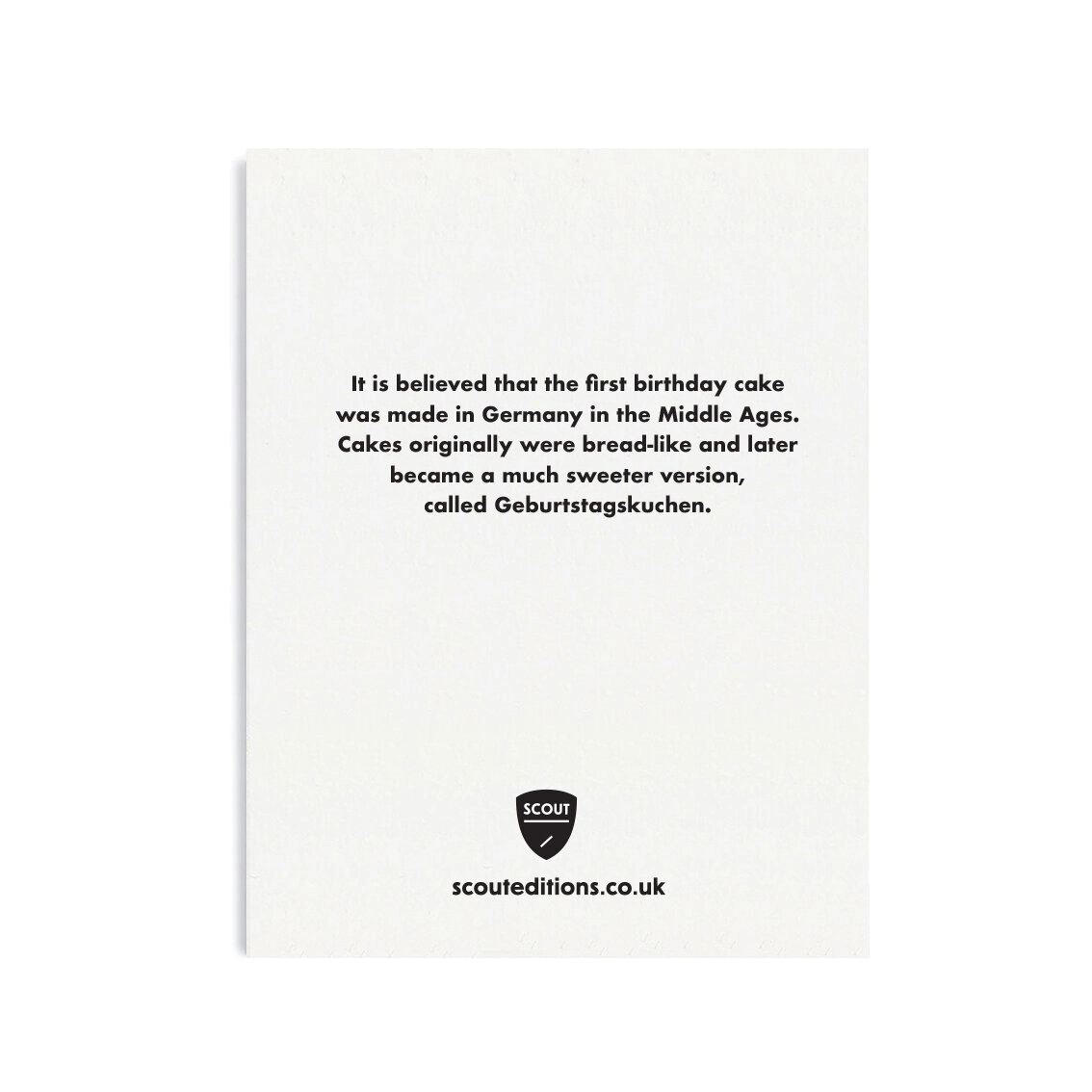 Send a cute greeting with this riso-printed card by the UK's Scout Editions. The back of the card reads: "It is believed that the first birthday cake was made in Germany in the Middle Ages. Cakes originally were bread-like and later became a much sweeter version, called Geburtstagskuchen."