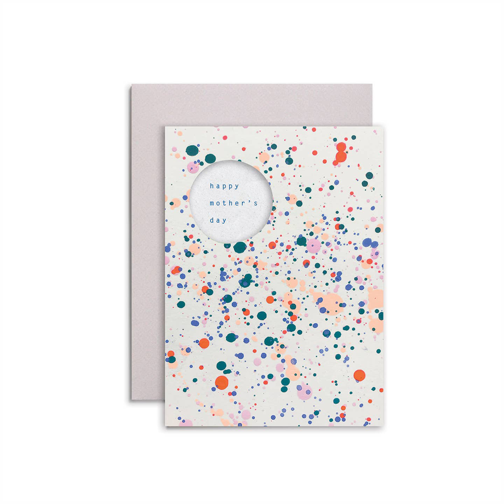 Send a unique Mother's Day greeting with a hand-painted card from Iowa. Each folded card is one-of-a-kind with a painted pattern on light gray speckled card stock with a die-cut window that reveals the "happy mother's day" foil-printed type inside.