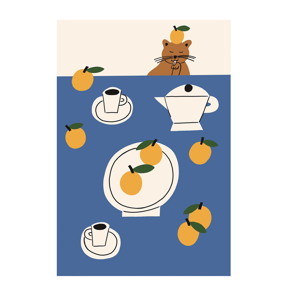 Send warm greetings with this charming fruity feline coffee scene illustrated by Karl-Joel Larsson.