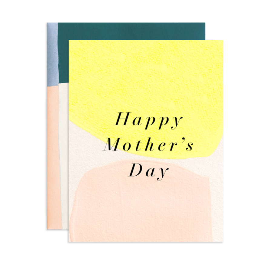 Send a one-of-a-kind Mother's Day greeting with this hand-painted folded card from Iowa. Each card is unique with its own pattern of yellow and pink and general shapes with text stamped in black foil.