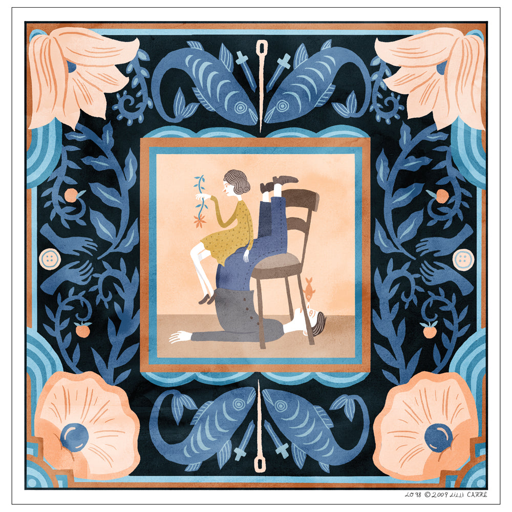 Lilli created this limited edition full-color offset print as a companion to her wonderful book Nine Ways to Disappear. With art deco flair, Lilli brings bold rich colors to her frame full of recognizable elements from the book. In the center you’ll find a comically absurd scene that riffs off one of her humorous takes on disappearing.
