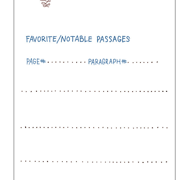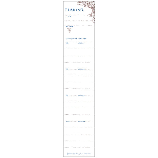 Never ones to waste, we fit these awesome reading bookmarks in the margin of our greeting cards. We came up with the idea to have a bookmark you could take notes on while you’re reading and then leave in your book for reference. Our great friend Martine Workman brought it to life with her handdrawn flourishes, typography, and dotted lines. The bookmark is made so that you can write down the title and author (just in case it gets separated from the book) and make note of your favorite passages with room for the page & paragraph number and a brief thought about it. We’re selling them in a pack of 10 so you can use them in different books or share with friends. They’re printed in Hayward, CA with vegetable-based inks on 100% post-consumer recycled paper. Measures 8.75” tall x 1.75” wide.