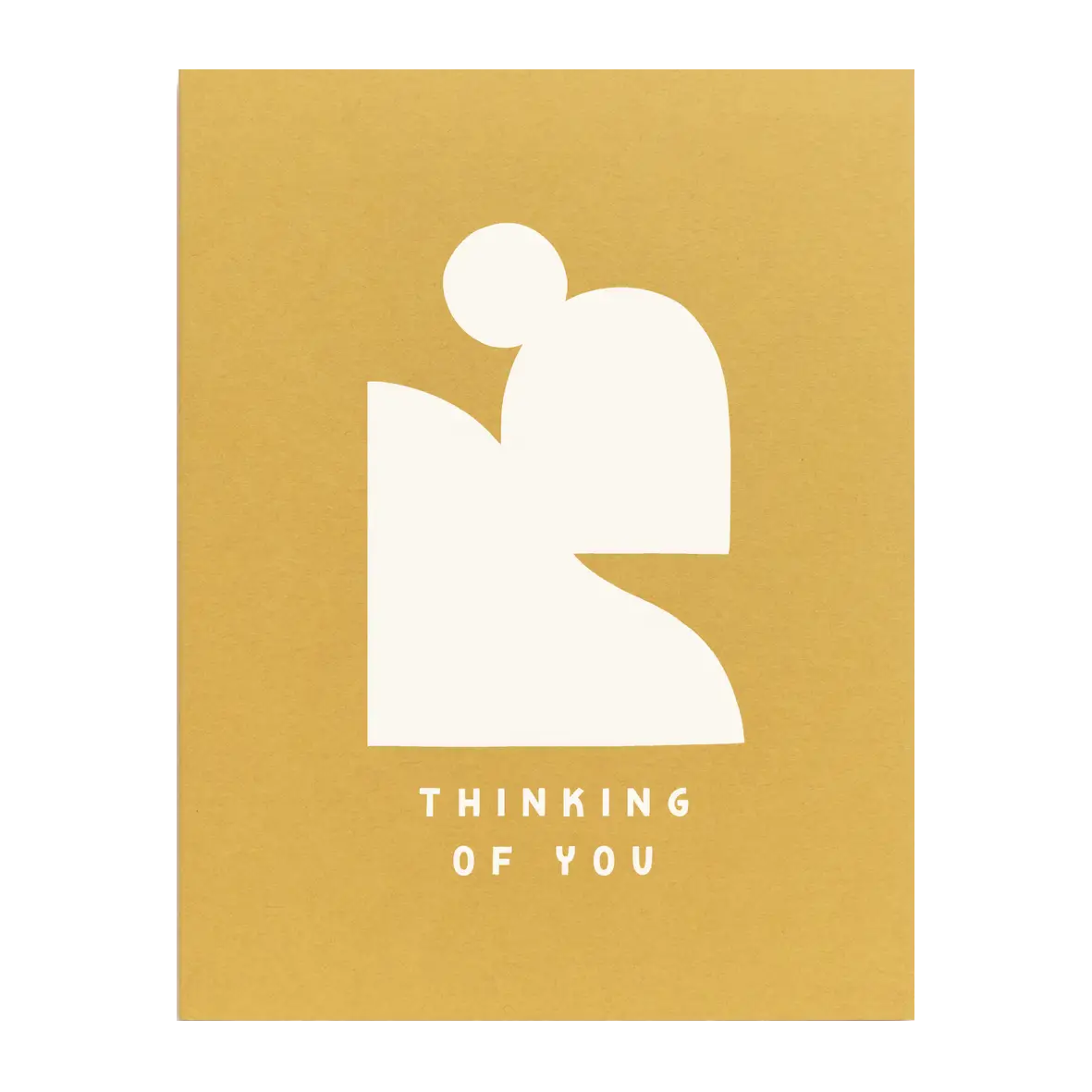 Measures 4.25" wide x 5.5" tall, blank inside. Screen printed with hand-mixed white ink on mustard card stock. Comes with an envelope in a sleeve.