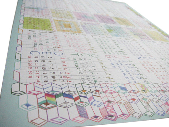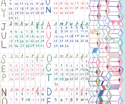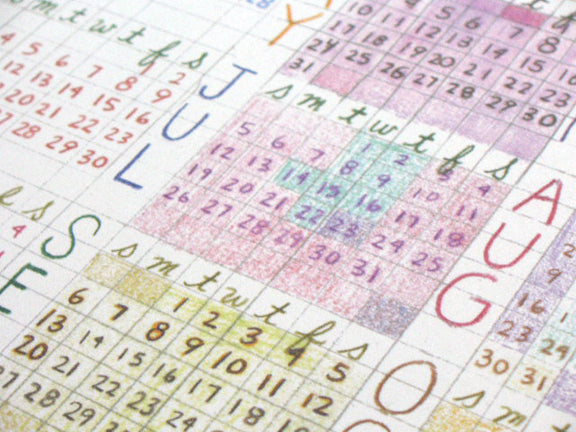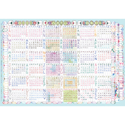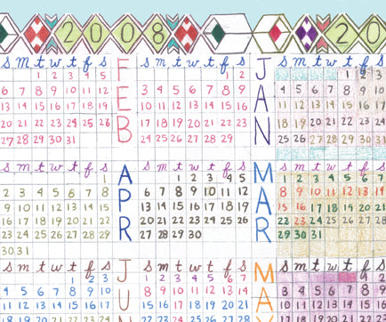 Lart drew multiple versions (an immense amount of work!) of the 2008-2010 reference calendars for her Come Along Weekly Planner (LO44) using color pencil, and a lot of them at that, especially considering it was going to be printed in one color. When she showed us one of the versions that she didn’t end up using, we liked it so much that we thought we should make it a calendar of its own. So here it is! It’s kind of crazy to be thinking about 2010 already, but it’s only a couple of years down the road (hello HAL) and for those of you who need to do some long-term planning, it’s a fun, hand-drawn way to look ahead. Great for an office wall or desk!